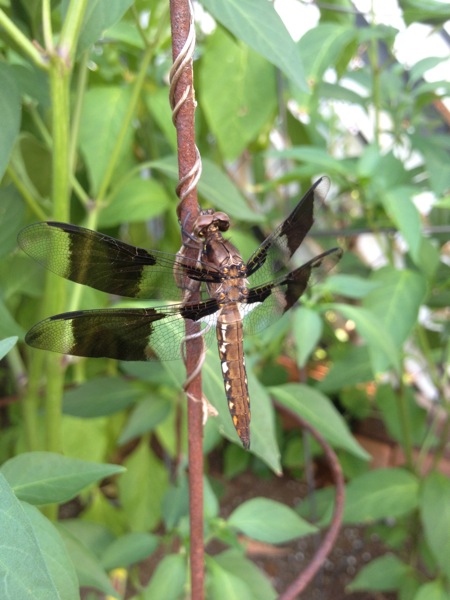 I also finally caught a photo of one of the really neat dragonflies that have been hanging around the plot all summer. I just missed getting a photo of a little green praying mantis on the banana peppers, too, which is SO cool!
