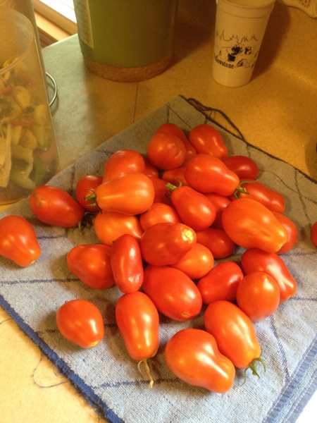 The pepper plants are doing quite well, though not yielding as much as the tomatoes. I think that's typical, though. I definitely want to plant more peppers next year but space them out better. I'm never sure when to pick some of the new varieties like the red chilis and Poblanos. There are quite a few peppers on the red chili plant, but they're not red so I haven't felt confident to pick them. The Cajun belles are doing well, too, though they are not big bell-pepper sized peppers like I expected. They're bell pepper shaped, but very small! I need to get MB to report on the various kinds and how they taste, how spicy they are, etc. since I don't eat anything but the sweet bananas and bells chopped up in sauces.